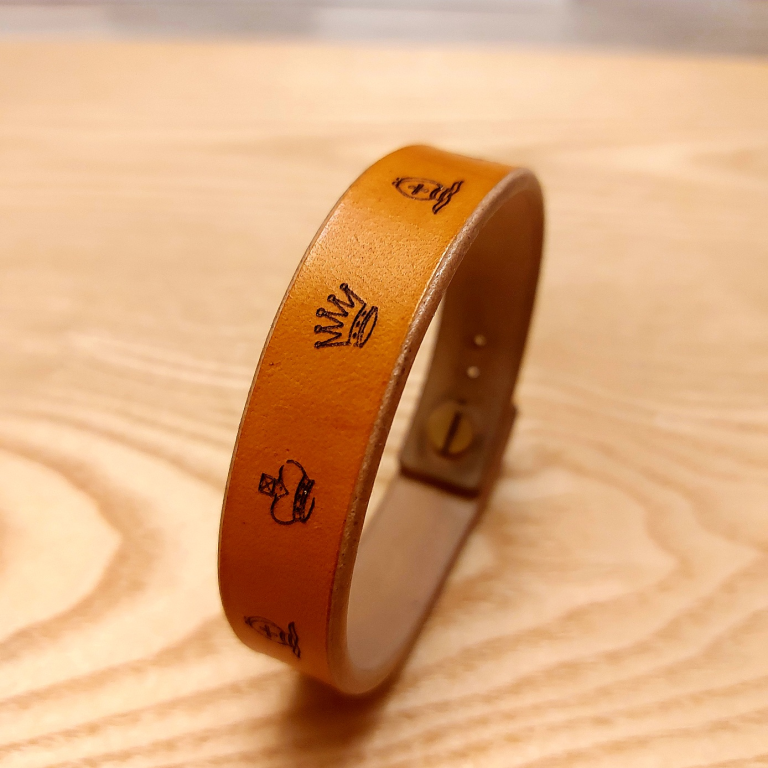 Rozcięty pasek barwionej skóry został odpowiednio poddany procesowi obróbki. Fazowane i przypalone krawędzie zostały pokryte profesjonalną bezbarwną farbą do krawędzi. Całość zabezpieczyliśmy dla Ciebie najlepszymi olejami i finishami do skóry. Zwieńczeniem wyrobu jest laserowo wypalony motyw figur szachowych.